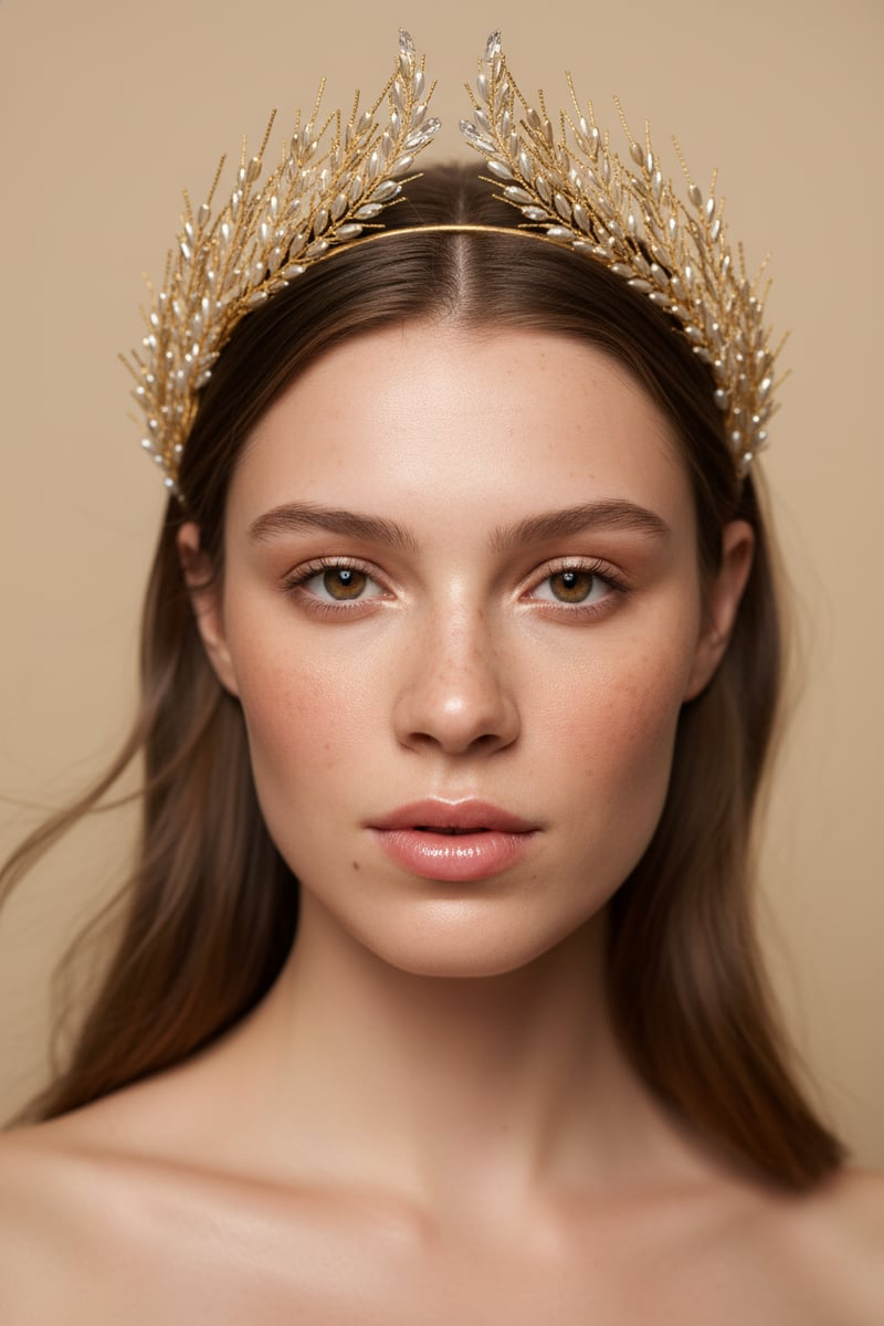 The Aurelia headpiece embodies modern royalty with its delicate golden branches and pearl accents. Designed to frame the face with graceful symmetry, it creates a luminous, refined look for brides and special occasions. Lightweight and comfortable, it elevates any hairstyle with effortless sophistication and timeless charm.