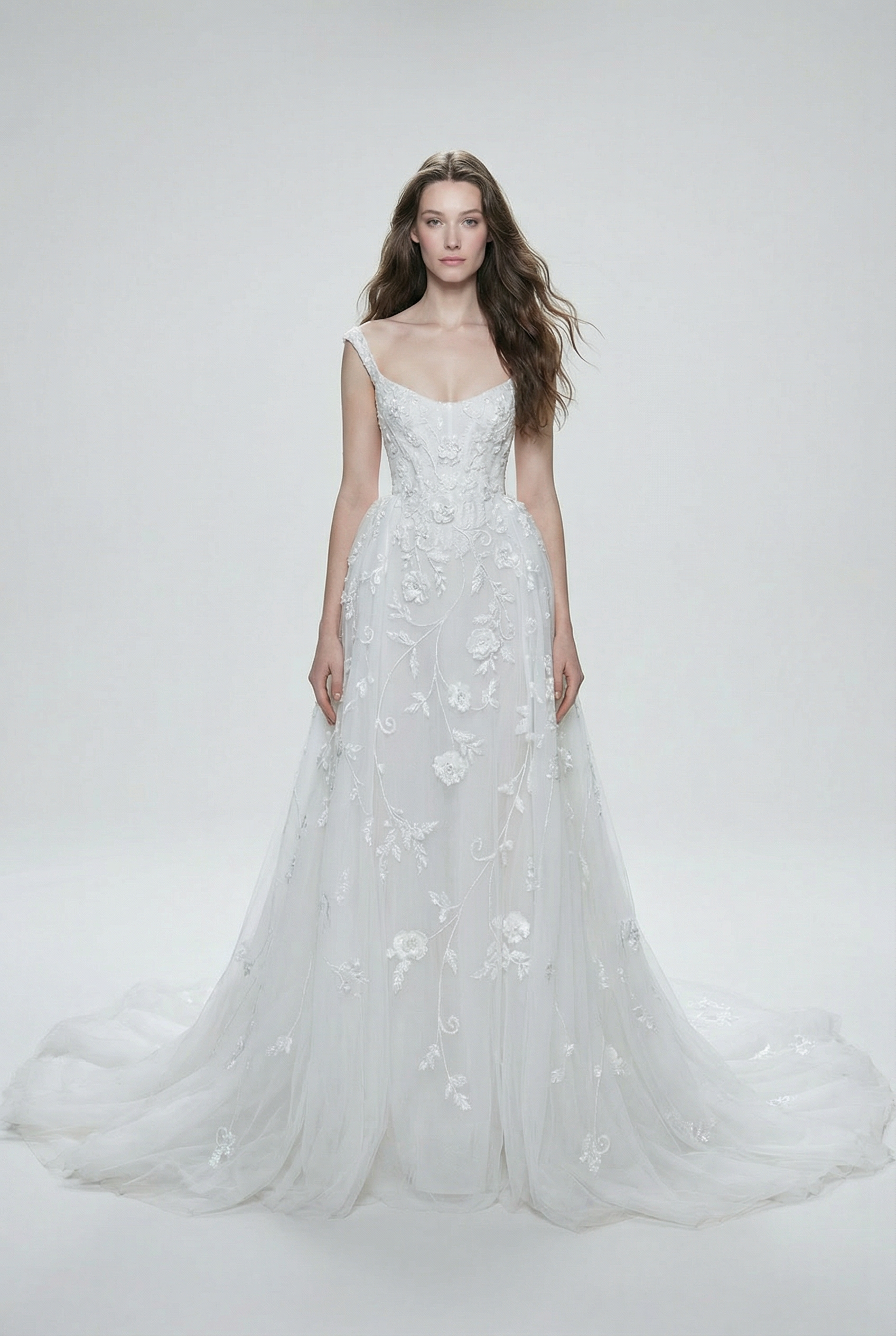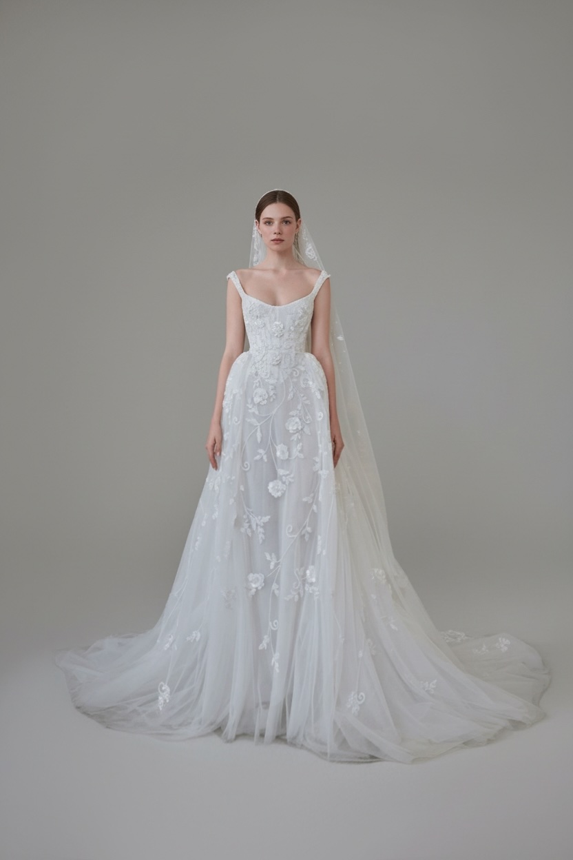 A romantic bridal gown crafted with a softly structured bodice and delicate straps, layered in sheer tulle embroidered with floral motifs. The fluid A-line silhouette extends into an airy train, creating an ethereal movement ideal for modern yet timeless ceremonies.