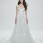 Zarif askılı, yumuşak yapılı korsajı ve çiçek motifli nakışlarla süslenmiş transparan tül katmanlarıyla tasarlanan bu gelinlik, akıcı A-kesim silueti ve hafif kuyruğuyla romantik bir duruş sunar. Zamansız şıklık arayan modern gelinler için ideal bir seçimdir.
