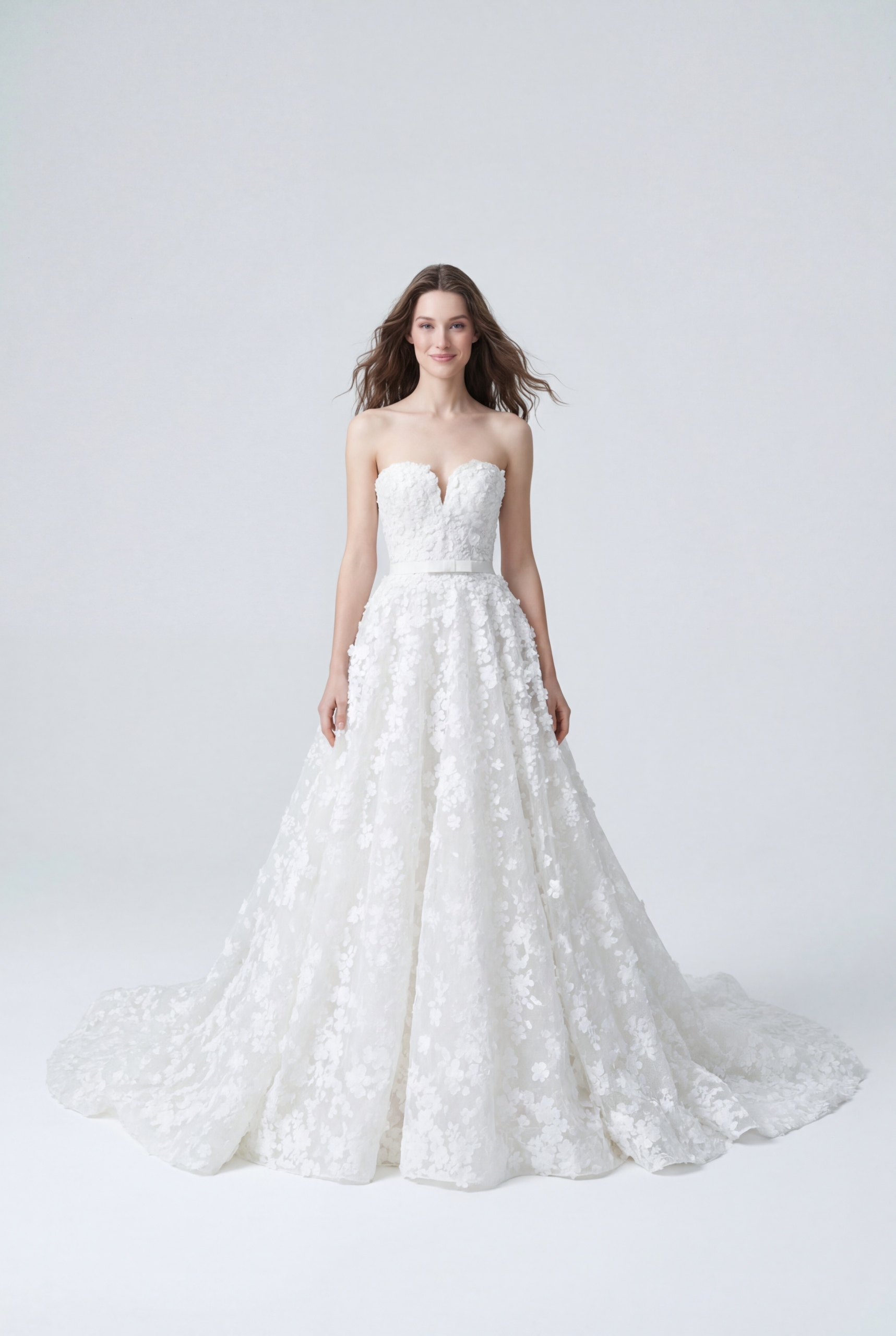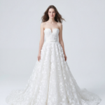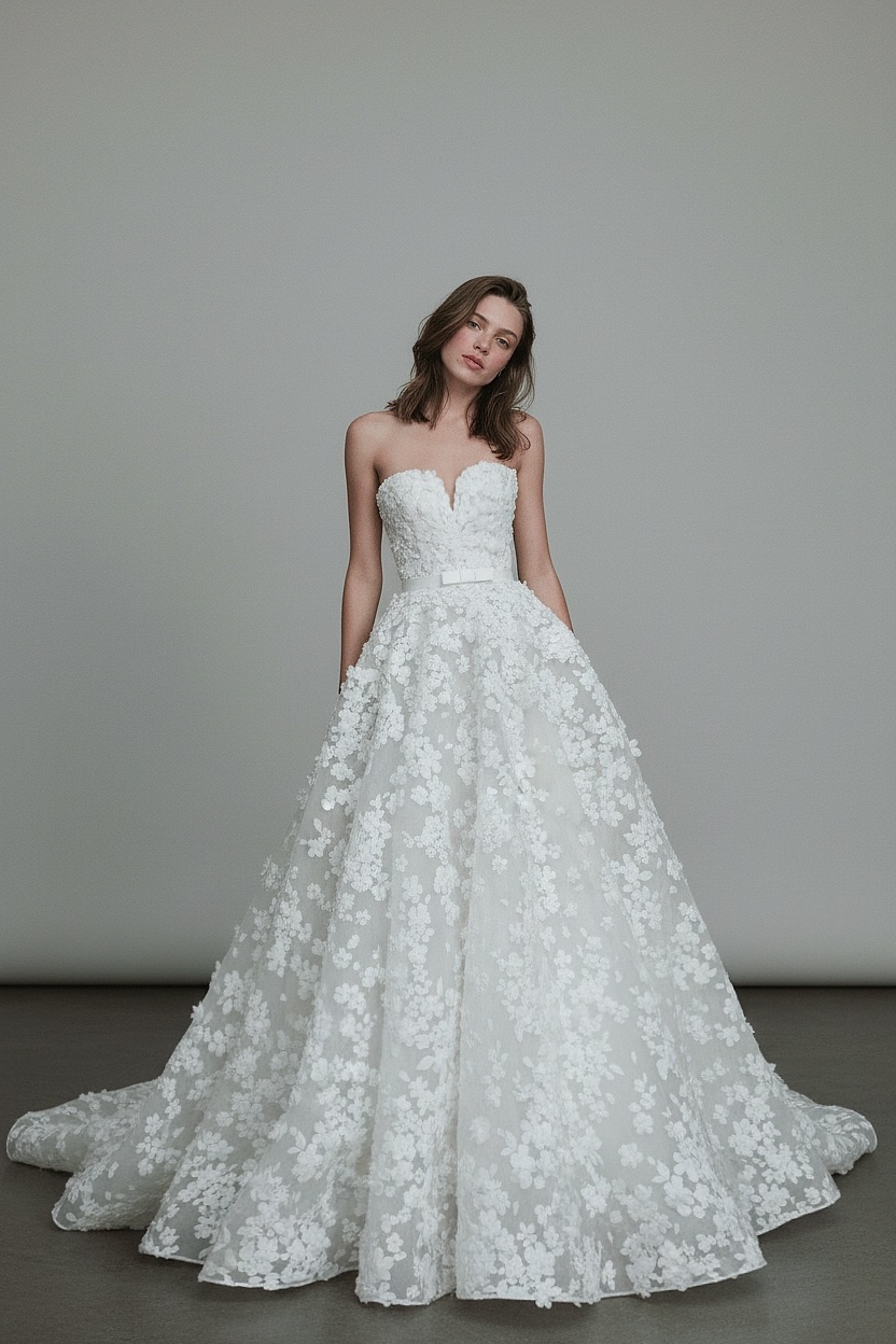 Başlıktan etek ucuna kadar uzanan üç boyutlu çiçek aplikeleriyle masalsı bir romantizm sunan bu prenses gelinlik, bahçe esintili zarif bir dokuya sahiptir. Straplez kalp yaka göğüs dekoltesini zarifçe vurgularken, hacimli etek her hareketle akıcı bir ihtişam yaratır. İnce kemer detayıyla tamamlanan tasarım, peri masalı zarafetini couture işçilikle buluşturur.