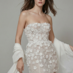 Zarif şeffaf bir zemin üzerine işlenmiş üç boyutlu çiçek aplikeleriyle dikkat çeken bu mini gelinlik, hem eğlenceli hem de sofistike bir duruş sunar. Straplez silüeti modern ve feminen bir hava yaratırken, el işçiliği detaylar couture zenginliği ekler. Nişan, resepsiyon, after party veya modern bir gelin görünümü arayanlar için mükemmel bir seçimdir.