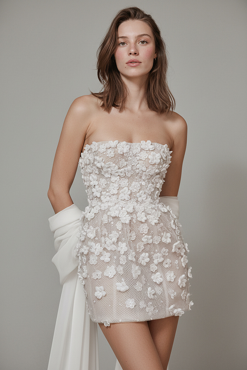 A playful yet sophisticated mini bridal dress adorned with dimensional floral appliqués over a delicate sheer base. The strapless silhouette creates a modern, feminine charm while the intricate hand-crafted detailing adds couture richness. Perfect for engagement parties, receptions, after-party bridal looks, or brides seeking a stylish contemporary statement.