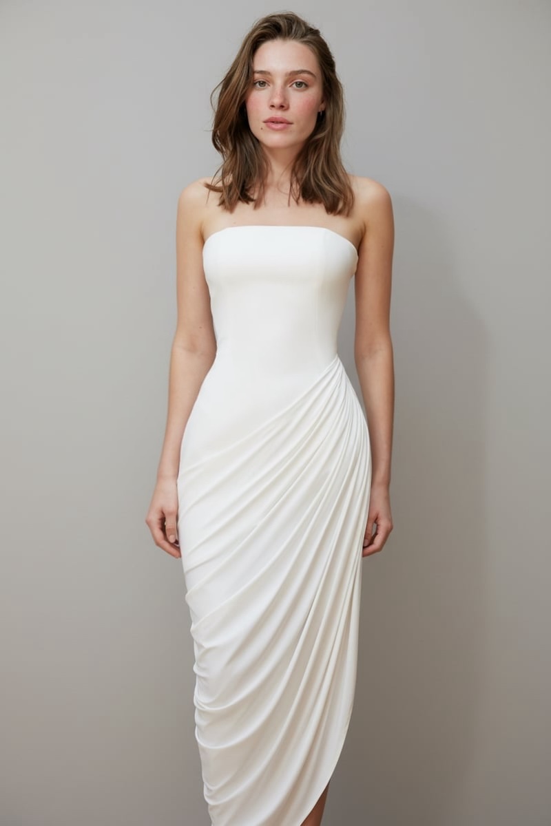 A refined strapless midi dress designed with a clean, sculpted bodice and elegant asymmetrical draping that softly contours the body. The fluid fabric enhances movement while maintaining a sleek, modern silhouette—perfect for civil weddings, rehearsal dinners, or elevated bridal celebrations.