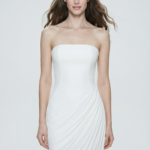 Temiz hatlara sahip straplez üst kısmı ve bedeni zarifçe saran asimetrik drape detaylarıyla tasarlanan rafine bir midi elbise. Akıcı kumaşı sayesinde hem hareket özgürlüğü sunar hem de modern ve zarif bir siluet yaratır. Nikah törenleri, after party veya şık bridal davetler için mükemmel bir seçim.