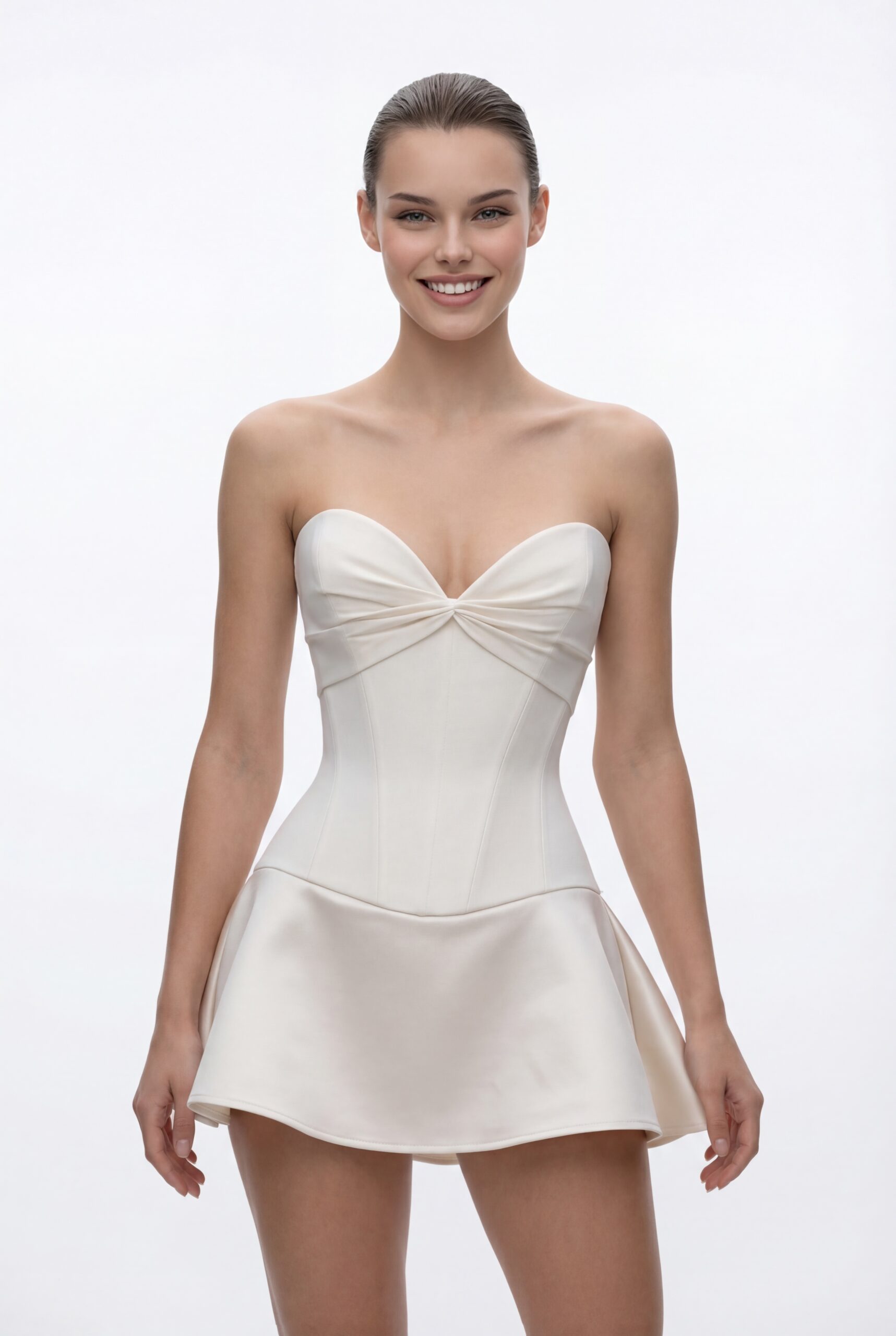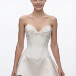 A sculpted silhouette defined by a sharply structured corset and a clean strapless neckline with a soft gathered center detail. The bodice contours the waist with precision, creating a strong, elongated shape that enhances the body’s natural lines. The mini bell skirt emerges seamlessly from the corset, adding volume and movement while maintaining a refined balance. The contrast between the structured upper body and the soft flared skirt creates a modern couture attitude — minimal, confident, and striking in its simplicity.
