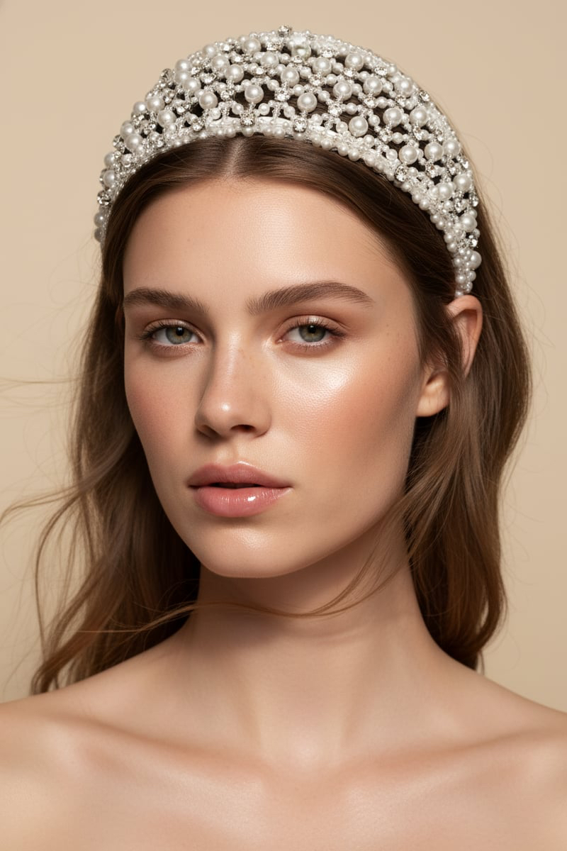 A statement pearl headpiece meticulously handcrafted with a sculptural lattice of luminous pearls and crystals. Designed to create an elevated, crown-like silhouette, it blends regal elegance with modern couture sensibility. Each pearl is carefully placed to reflect light with a soft, radiant glow, offering a breathtaking finish from every angle. Lightweight yet impactful, this piece transforms any bridal look with dramatic sophistication—perfect for brides seeking a bold, contemporary accessory with timeless charm.
