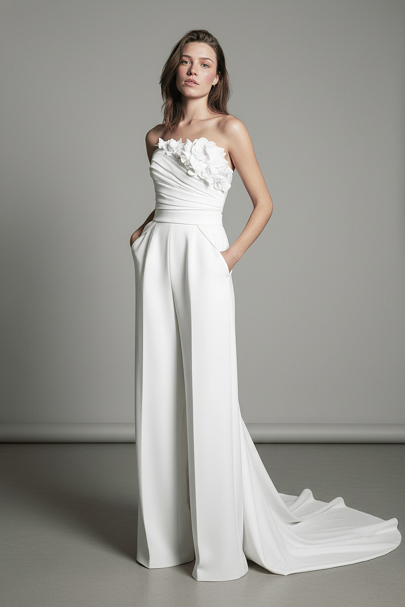 A modern couture bridal jumpsuit designed for the confident contemporary bride. Featuring a strapless asymmetrical bodice adorned with sculpted floral appliqués, it cinches at the waist before flowing into wide-leg tailored trousers. The elegant extended train adds bridal drama while pockets bring effortless ease and attitude.