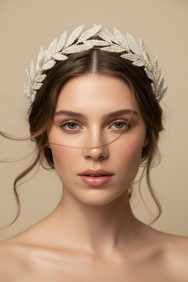 A refined laurel-inspired crown handcrafted with intricate pearl beading on each leaf, creating a look of timeless elegance. This headpiece blends classical symbolism with modern bridal sophistication, offering a graceful silhouette that frames the face beautifully. Lightweight and comfortable, it is perfect for weddings, engagement shoots, or any occasion that calls for a touch of ethereal romance and elevated style.