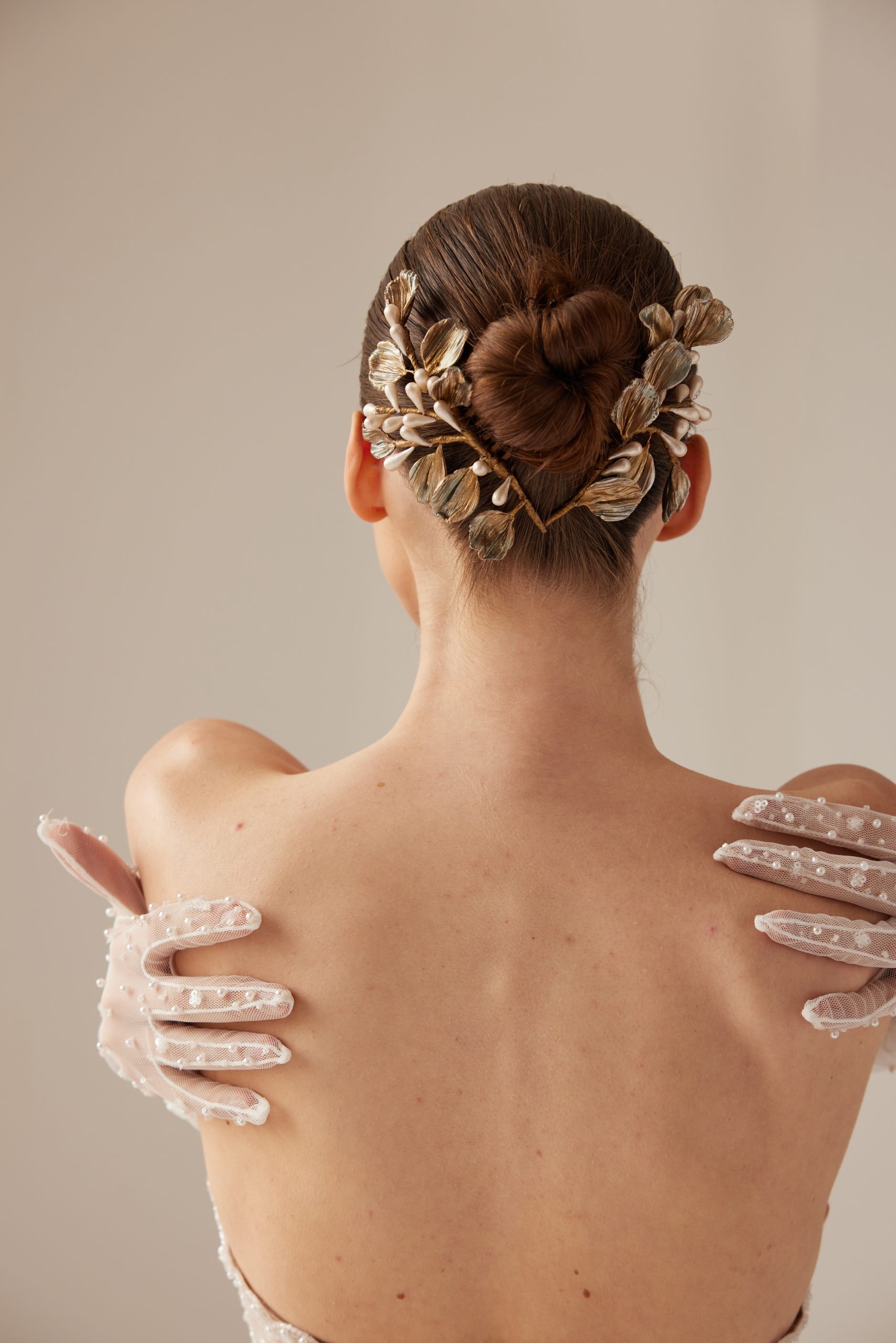 Aurelia Altın Yaprak Gelin Saç Tarağı, zarafeti ve doğadan ilham alan detayları bir araya getiren özel bir tasarımdır. Metalik altın yapraklar ve ince inci süslemeler, saç modeline romantik bir ışıltı katar. Topuz, örgü veya yarım toplu modellerle mükemmel uyum sağlar. Hafif yapısı sayesinde gün boyu rahat kullanım sunarken, şık dokusuyla gelinliğinizi kusursuz biçimde tamamlar. Zamansız ve göz alıcı bir gelin görünümü için ideal bir seçimdir.