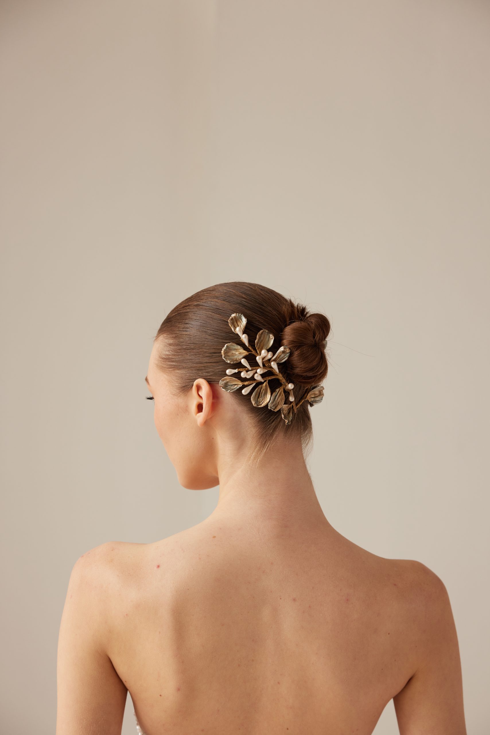 The Aurelia Gold Leaf Bridal Hair Comb blends elegance with nature-inspired details. Featuring metallic gold leaves and delicate pearl accents, it adds a romantic touch to any bridal hairstyle. Designed to complement buns, braids, or half-up styles, it is lightweight and comfortable for all-day wear. Its refined finish elevates your bridal look with timeless beauty and subtle sparkle.