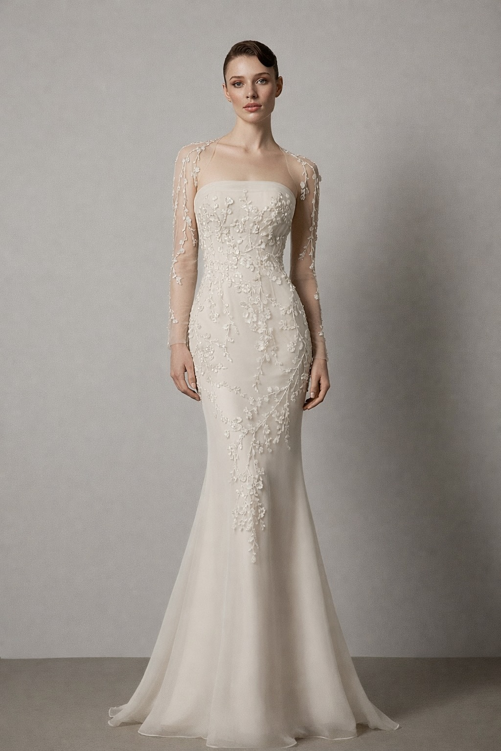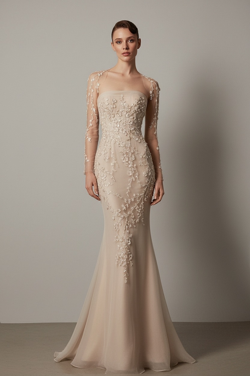 A refined mermaid silhouette crafted in soft tulle and delicate embroidery, this gown features a strapless bodice paired with an ethereal illusion overlay and long sleeves embellished with floral appliqués. Figure-skimming lines highlight the waist while the flowing skirt adds graceful movement, perfect for the bride seeking elegance, romance, and subtle drama.