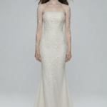Yumuşak tül ve zarif işlemelerle tasarlanan bu denizkızı silüetli gelinlik, straplez gövde üzerine yerleştirilen transparan illüzyon üst ve çiçek aplikeli uzun kollarıyla dikkat çeker. Vücudu zarifçe saran hatları beli vurgularken, akıcı etek hareketli ve romantik bir duruş yaratır. Zarafet, romantizm ve ince bir drama isteyen gelinler için mükemmel bir seçim.