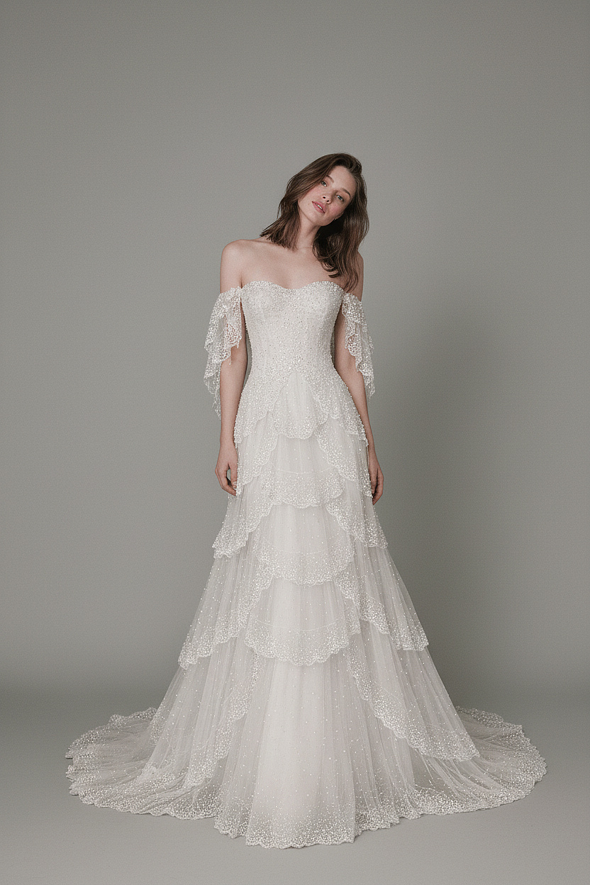 A romantic vision brought to life, this off-shoulder bridal gown features delicately draped sleeves and a softly sculpted bodice that flatters the neckline. Layered tulle tiers cascade into a flowing train, each scalloped edge finished with intricate beading that adds subtle sparkle with every movement. A perfect balance of femininity, elegance, and dreamlike charm.