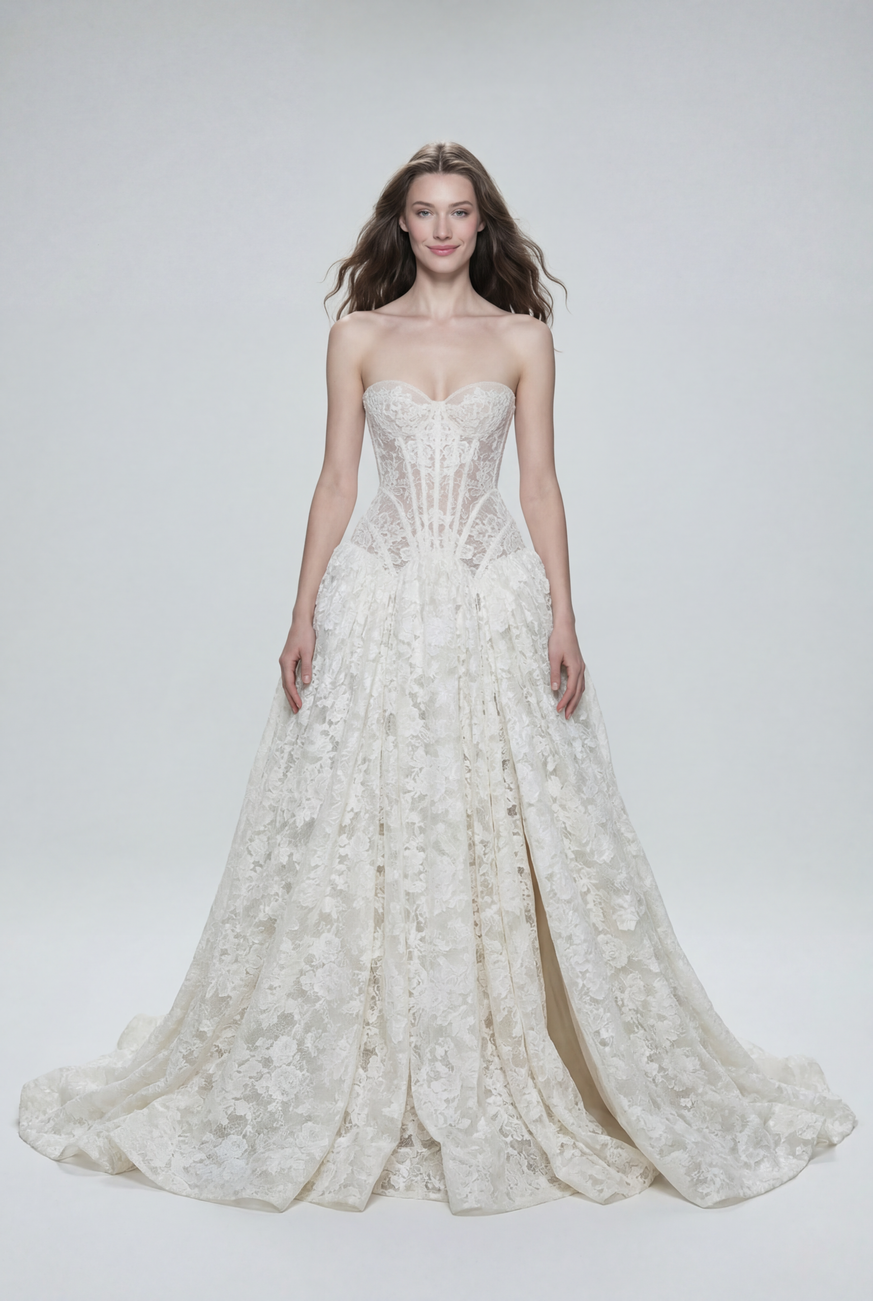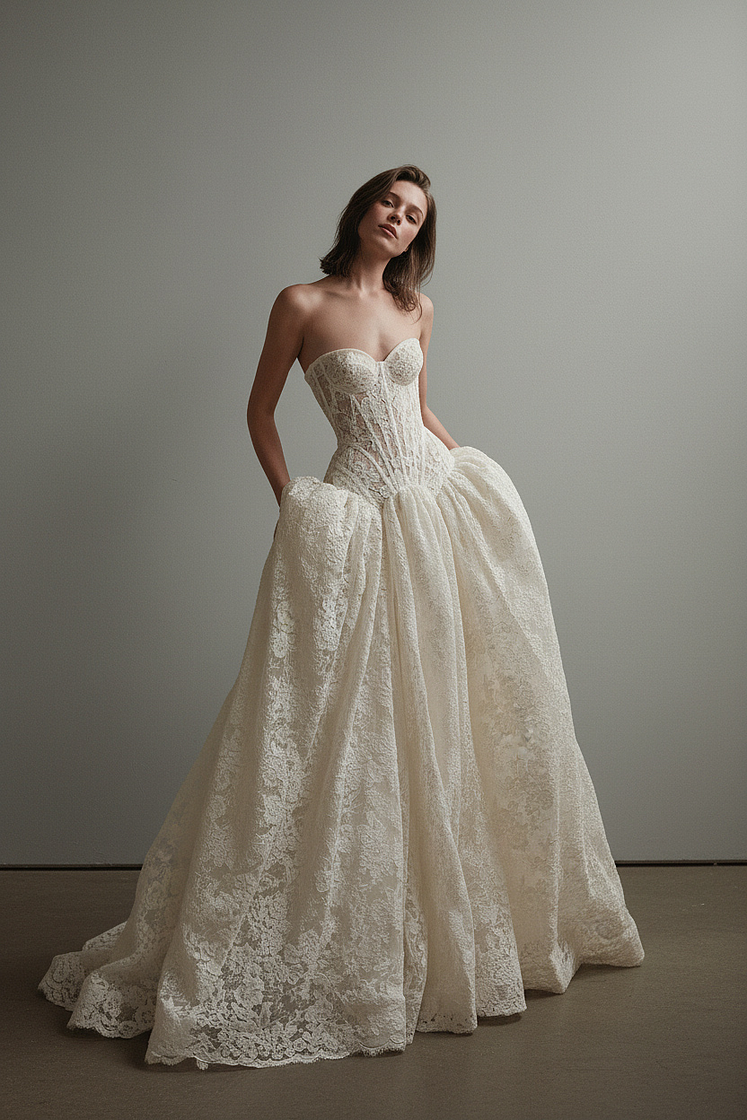 A modern couture ball gown featuring a sculpted corset bodice that beautifully shapes the silhouette, flowing into a voluminous lace skirt with timeless romantic presence. Exquisite lace detail and refined structure create a powerful yet effortlessly feminine bridal statement.