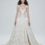 Vücudu zarifçe şekillendiren modern korse üst kısmı ve etkileyici hacimli dantel eteği ile romantizmi ve ihtişamı bir araya getiren couture bir gelinlik. İnce işçilikli dantelleri ve kusursuz kalıbıyla güçlü, zarif ve unutulmaz bir gelin görünümü sunar.