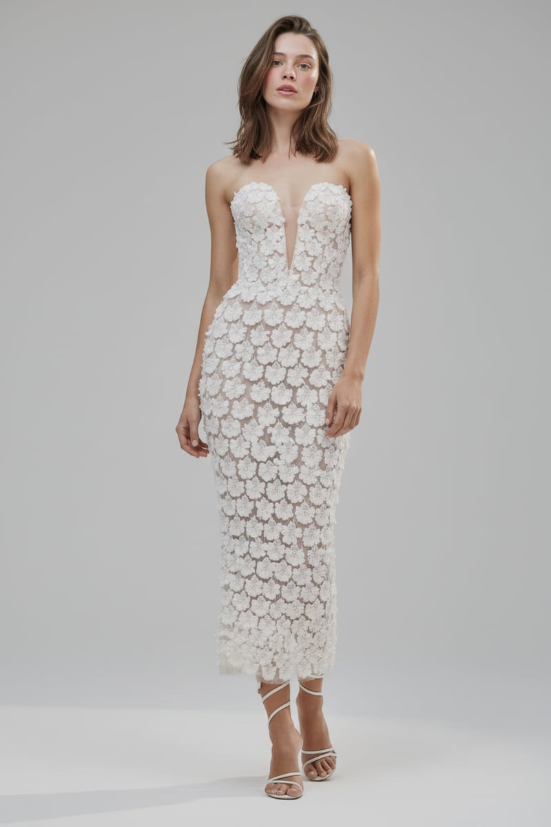İnce çiçek dantelleriyle şekillenen temiz ve kesintisiz bir siluet. Straplez yaka ve vücuda oturan formu, sade ama güçlü bir couture duruşu sunar.