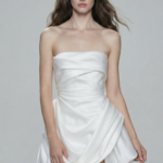 A clean strapless neckline frames the shoulders, while sculptural draping wraps the body with soft precision. Crafted in smooth satin, the asymmetrical skirt creates fluid movement and modern volume. A refined mini silhouette designed for contemporary brides, receptions, or after-party moments with effortless sophistication.