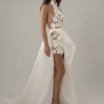 Şeffaf illüzyon zemin üzerine uygulanan üç boyutlu çiçek aplikeleriyle tasarlanan, halter yaka modern bir couture gelinlik. Açık yan detayları silueti ön plana çıkarırken, yumuşak ve akıcı overskirt tasarıma hareket ve dramatik bir zarafet katar. Cesur ama sofistike bir duruş arayan, moda odaklı gelinler için tasarlanmıştır.
