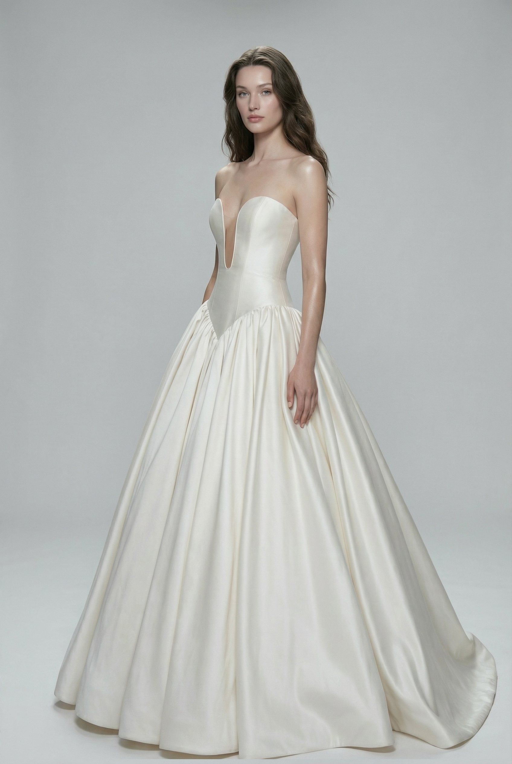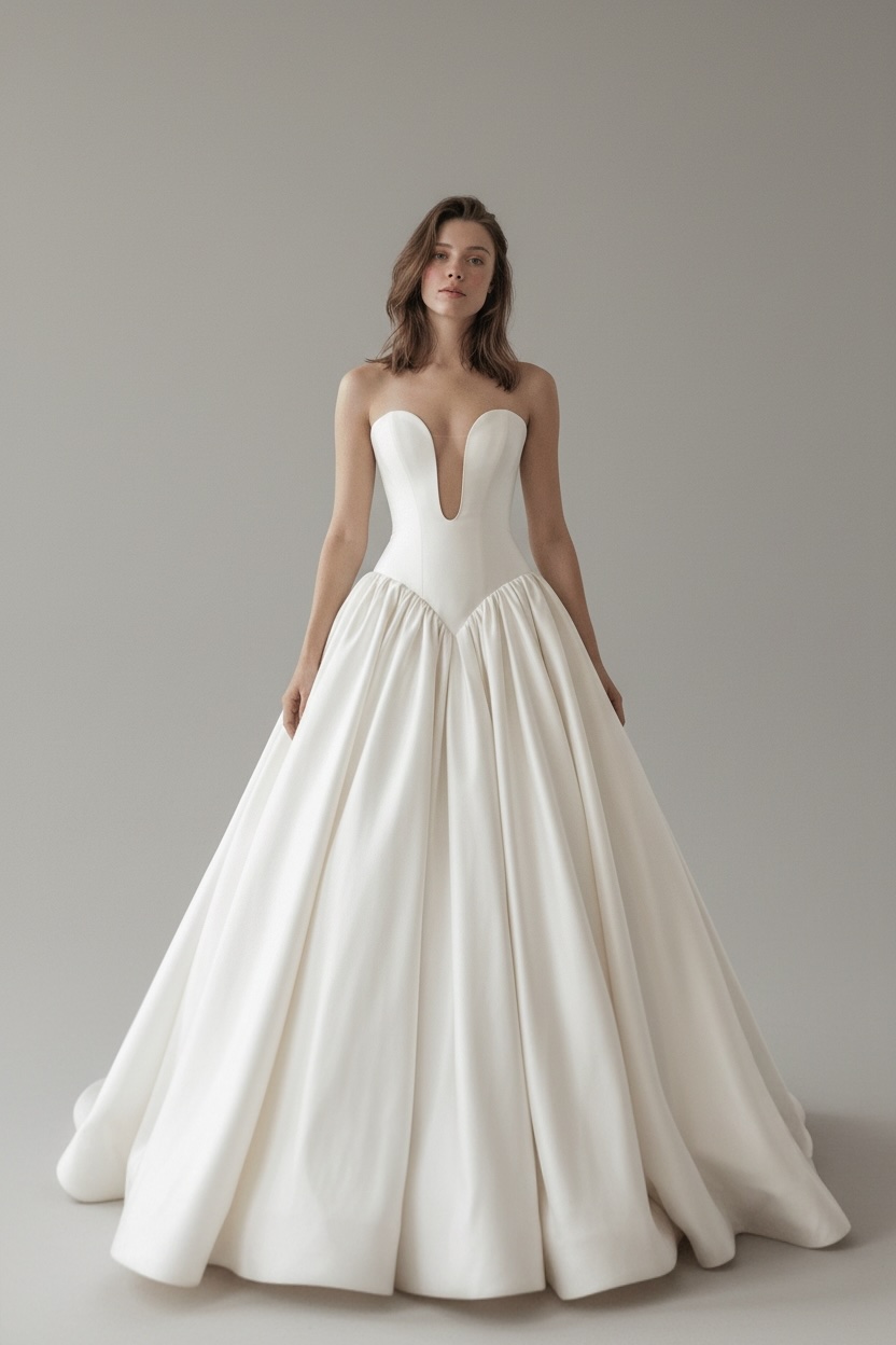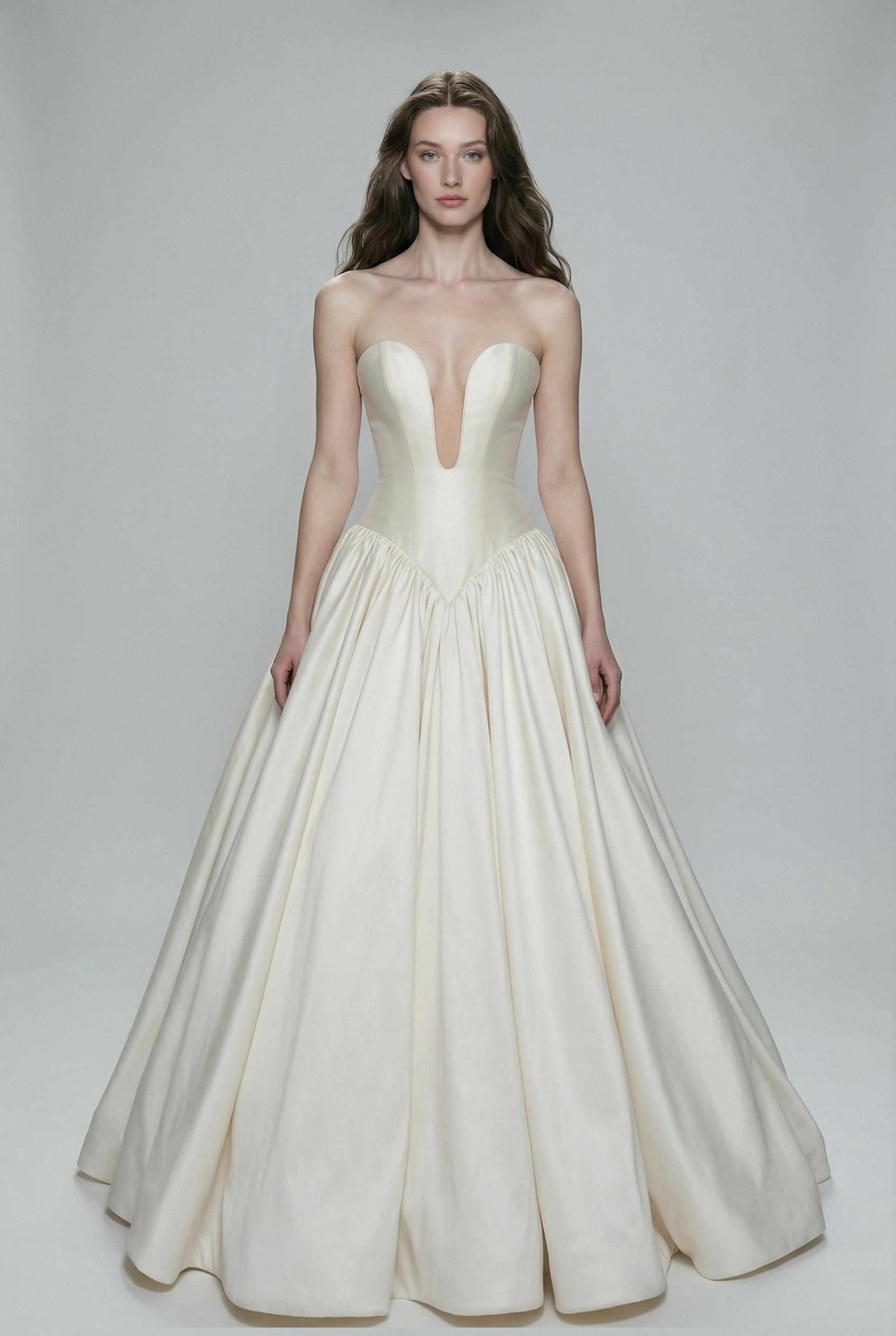 A modern bridal statement defined by a sculpted strapless bodice with a dramatic deep plunge neckline. The structured corset flows into a full, softly gathered ball gown skirt, creating a powerful yet elegant silhouette. Clean lines and architectural volume make this design ideal for brides seeking timeless minimalism with bold couture presence.
