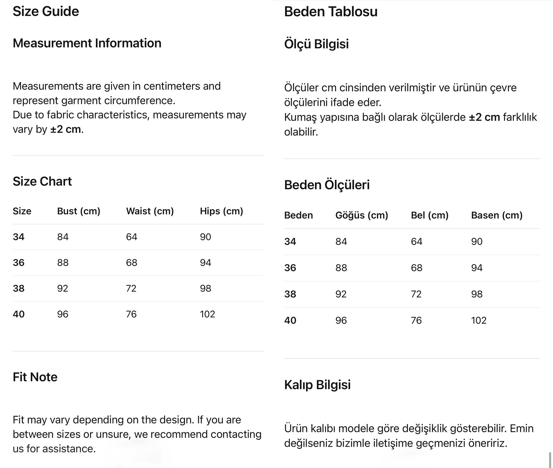Beden & Kalıp: Göğüs: 86 cm Bel: 61 cm Basen: 89 cm Modelin üzerindeki beden 36, boyu 1.78 cm.