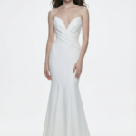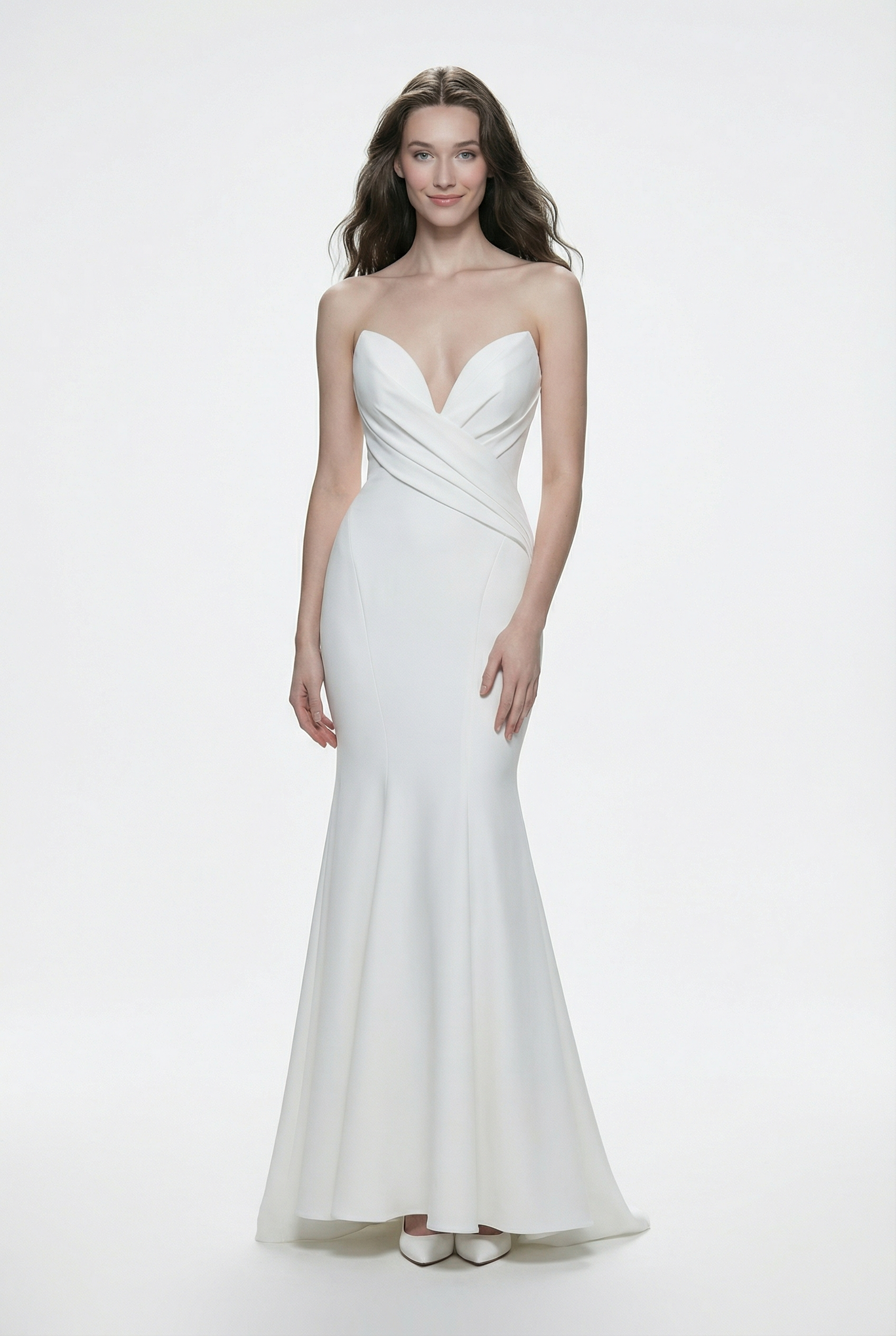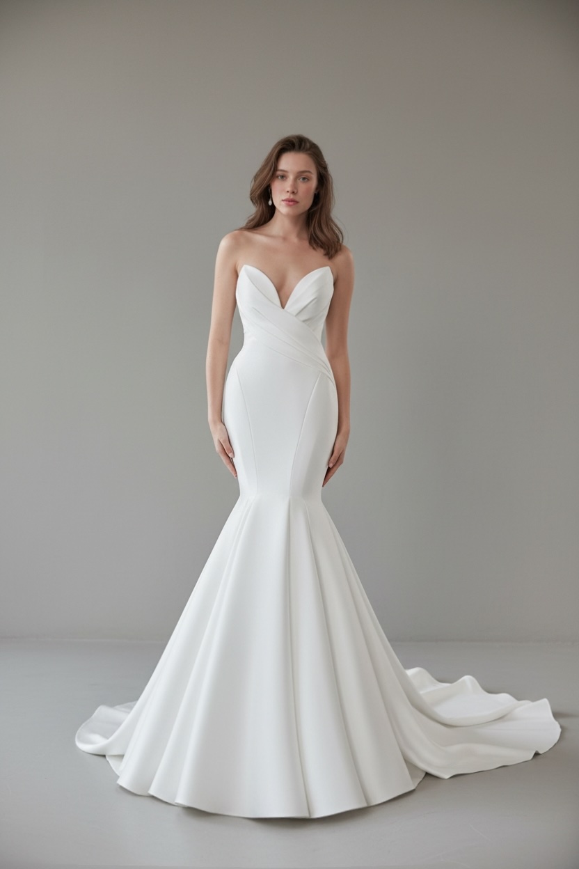 This elegant strapless mermaid wedding gown offers a sleek and modern silhouette, highlighted by a deep sweetheart neckline and a figure-enhancing fit. Subtle draped detailing at the waist refines the shape, while the flared skirt flows beautifully to create a sense of effortless luxury. Blending minimal sophistication with couture precision, it is the perfect choice for brides seeking a timeless yet striking look.