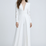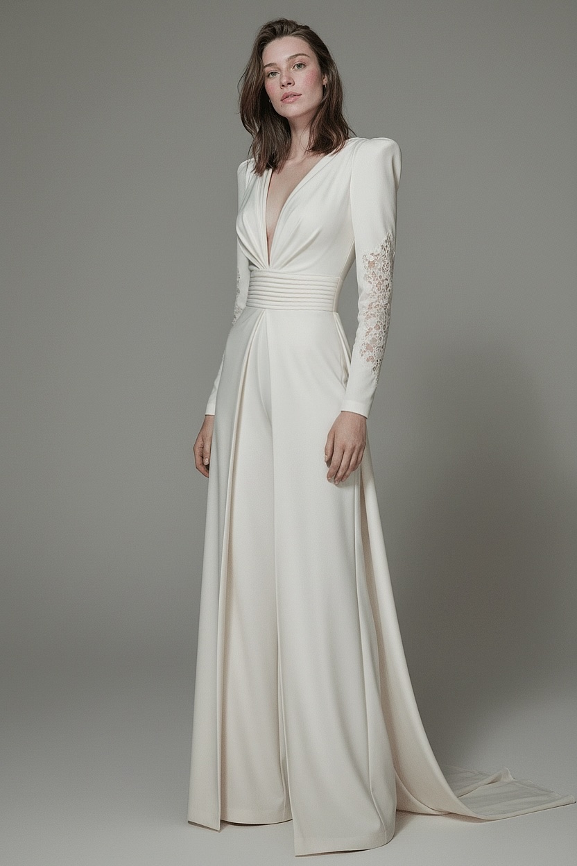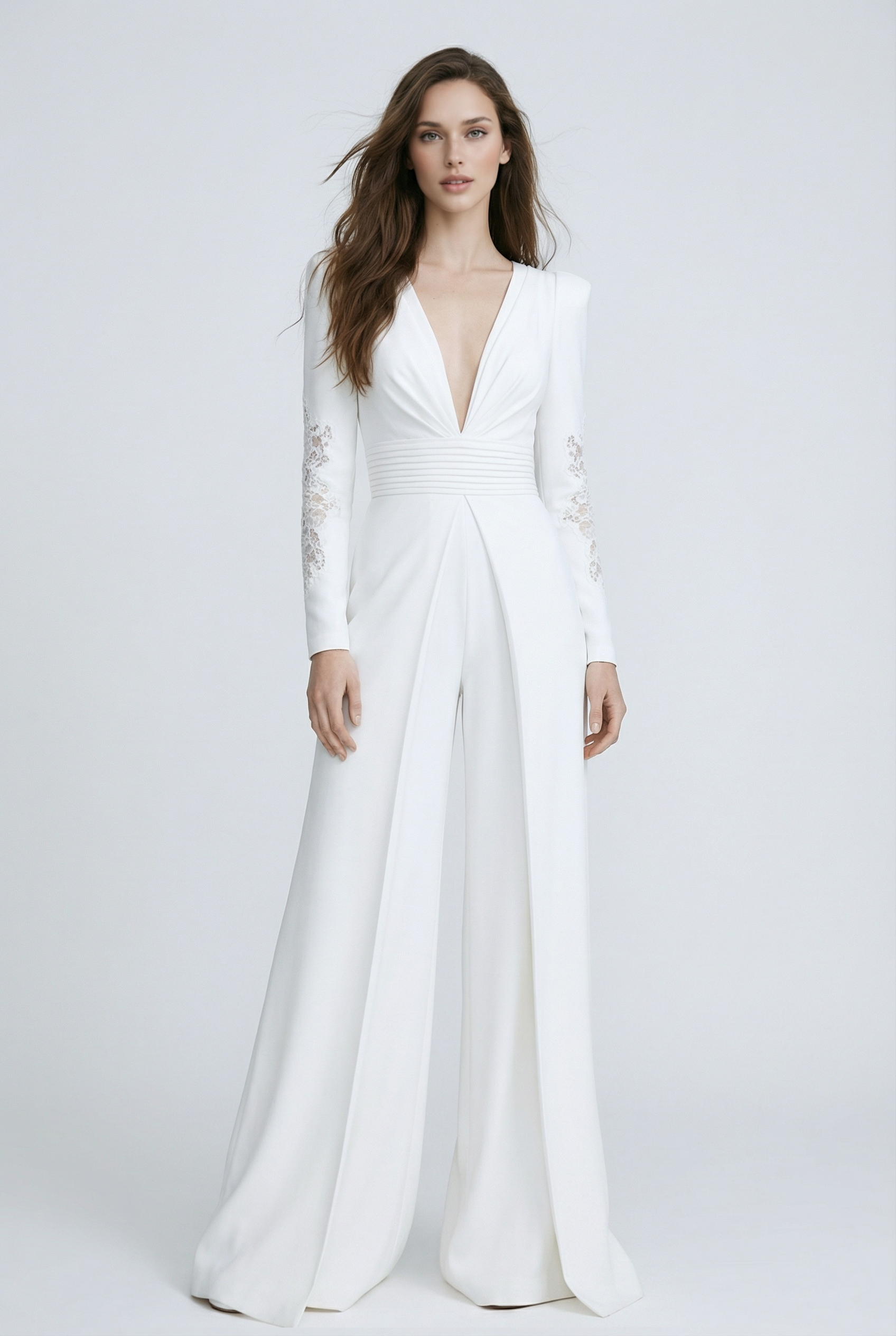 Designed for the modern bride, this refined bridal jumpsuit features a deep plunging neckline, structured shoulders, and a beautifully defined waist. The flowing wide-leg trousers create a striking balance of strength, elegance, and feminine sophistication.