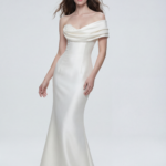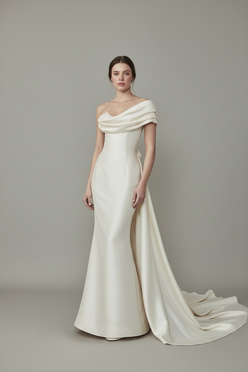 Hacimli drape detaylarıyla zarifçe şekillenen tek omuzlu saten gelinlik, modern şıklığı ve zamansız zarafeti bir araya getirir. Yumuşak düşüşlü yakası dekolteyi zarifçe çerçevelerken, vücuda oturan gövde akıcı bir etek ve zarif kuyrukla tamamlanır. Sessiz lüksün ve sofistike duruşun güçlü ifadesi.