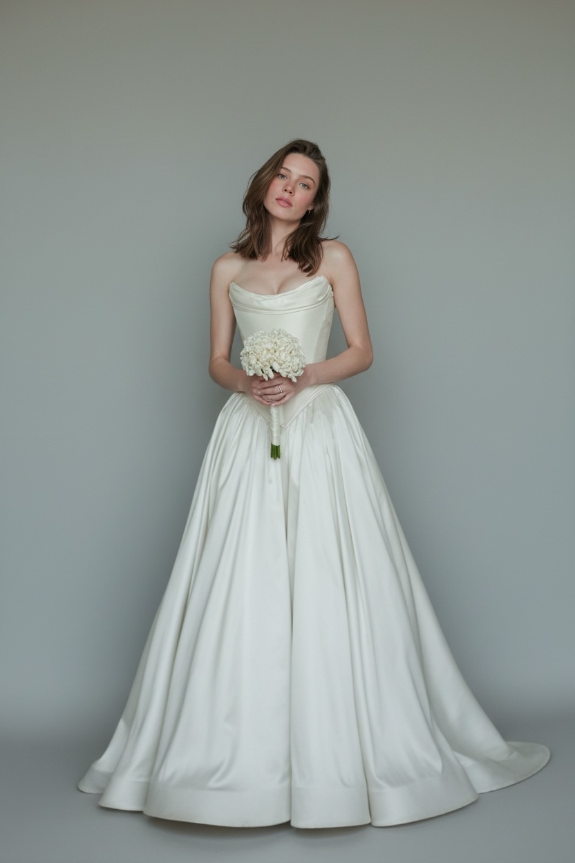 Lüks saten kumaşla tasarlanan bu zamansız prenses gelinlik, klasik zarafeti modern bir dokunuşla buluşturur. Yumuşak drapeli kalp yaka, dekolteyi zarifçe çerçevelerken, yapılandırılmış korse bel hattını kusursuzca vurgular. Hacimli ve akıcı etek ise asil ve romantik bir siluet yaratır.