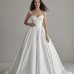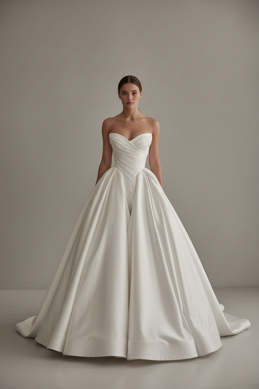 A sculpted sweetheart neckline meets elegant cross-draping that defines the bodice with architectural precision. The voluminous ball gown skirt unfolds in smooth, structured folds, creating a powerful yet timeless bridal silhouette. Designed for brides who seek classic grandeur with modern refinement.