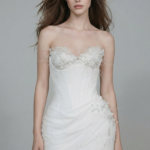 Yapılı korse gövdesi ve yaka hattındaki zarif çiçek işlemeleriyle öne çıkan modern bir mini gelinlik. Etek üzerindeki yumuşak drapeler siluete akış ve feminen bir denge kazandırırken, ince boncuk detayları couture bir ışıltı sunar. Modern nikâhlar, davetler veya after-party görünümleri için cesur ve çağdaş bir tasarım.