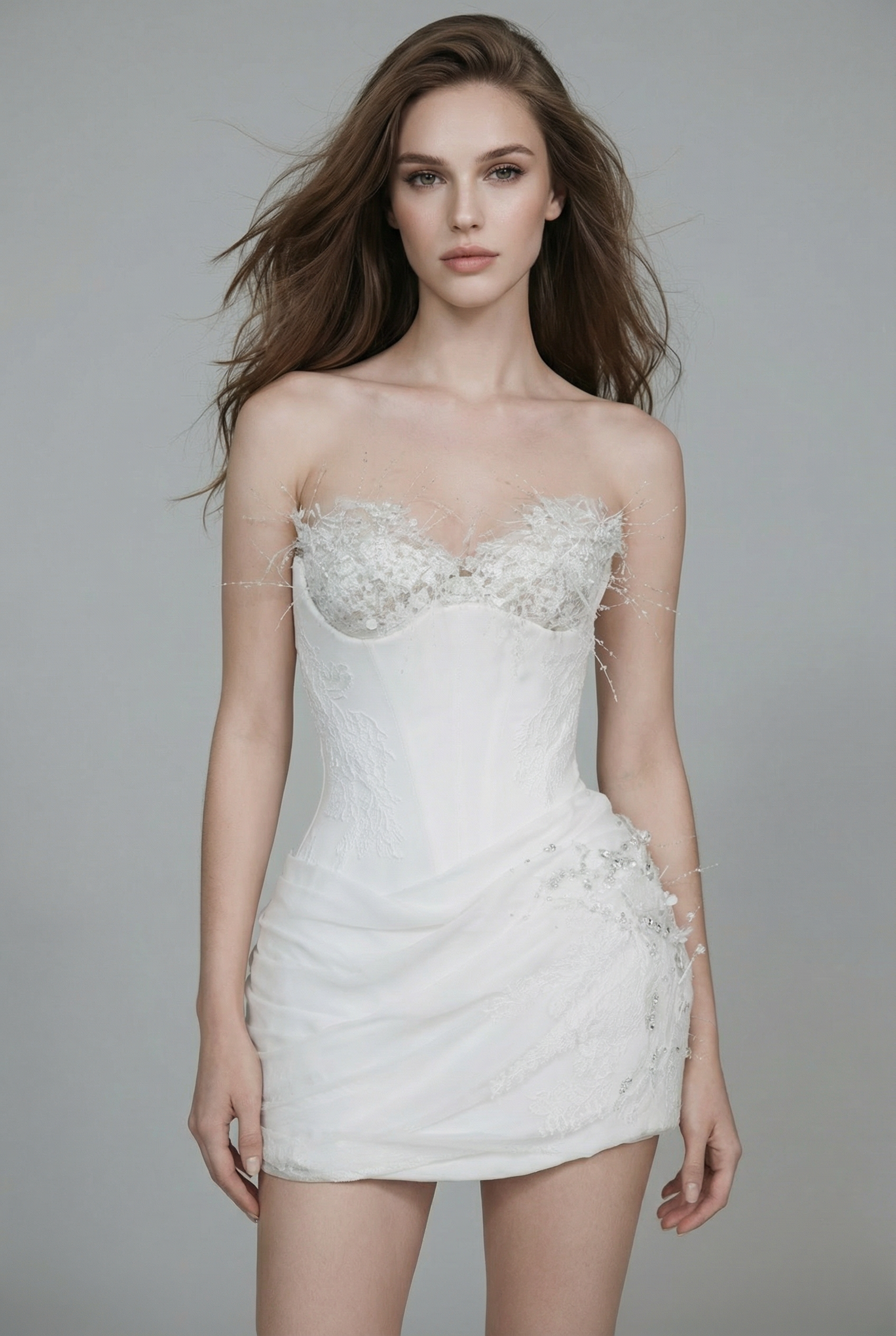 A modern bridal mini dress defined by a structured corset bodice and delicate floral embellishments along the neckline. Soft draping across the skirt adds movement and femininity, while subtle beadwork introduces a couture sparkle. Designed for contemporary ceremonies, receptions, or bridal after-parties with a confident, fashion-forward attitude.