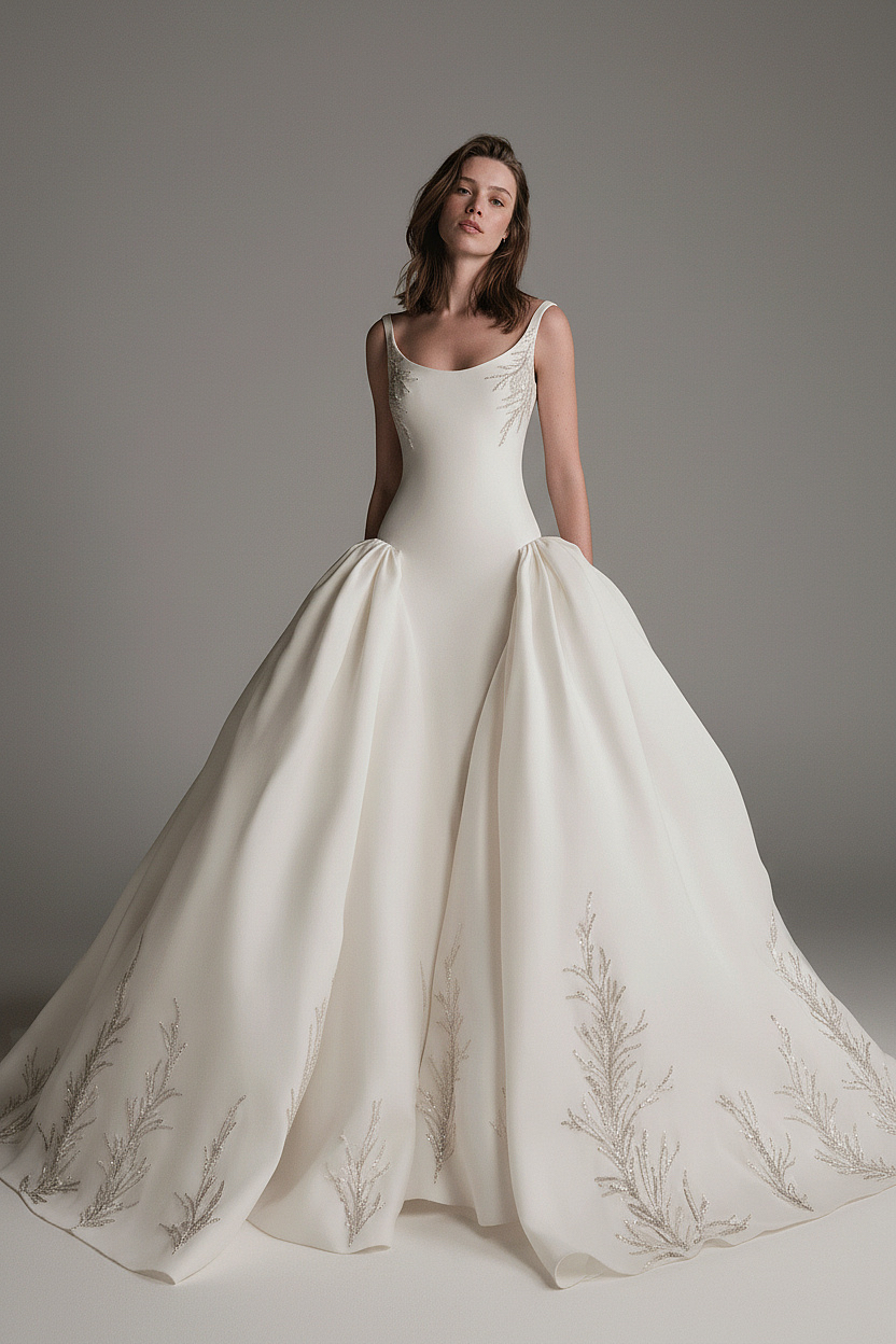 A luxurious bridal dress featuring a soft scoop neckline, fitted bodice, and voluminous skirt that flows beautifully with movement. Delicate embroidered leaf motifs add subtle sparkle along the bodice and hem, creating an elegant, refined, and unforgettable bridal look.