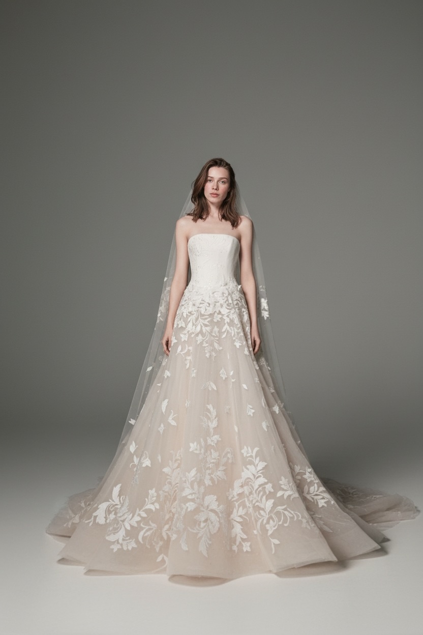 A refined strapless wedding gown featuring a clean, structured bodice that flows into a soft A-line skirt. Delicate embroidered leaf motifs cascade over sheer tulle, creating a light, romantic movement with understated couture elegance. Perfect for brides seeking modern grace with a poetic touch.