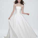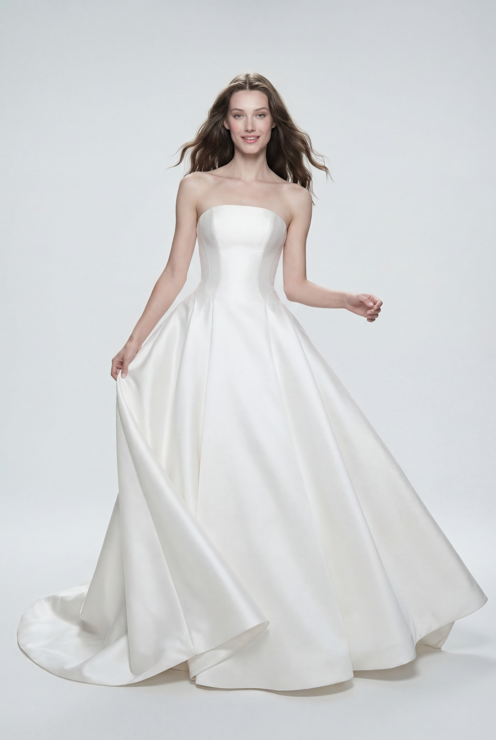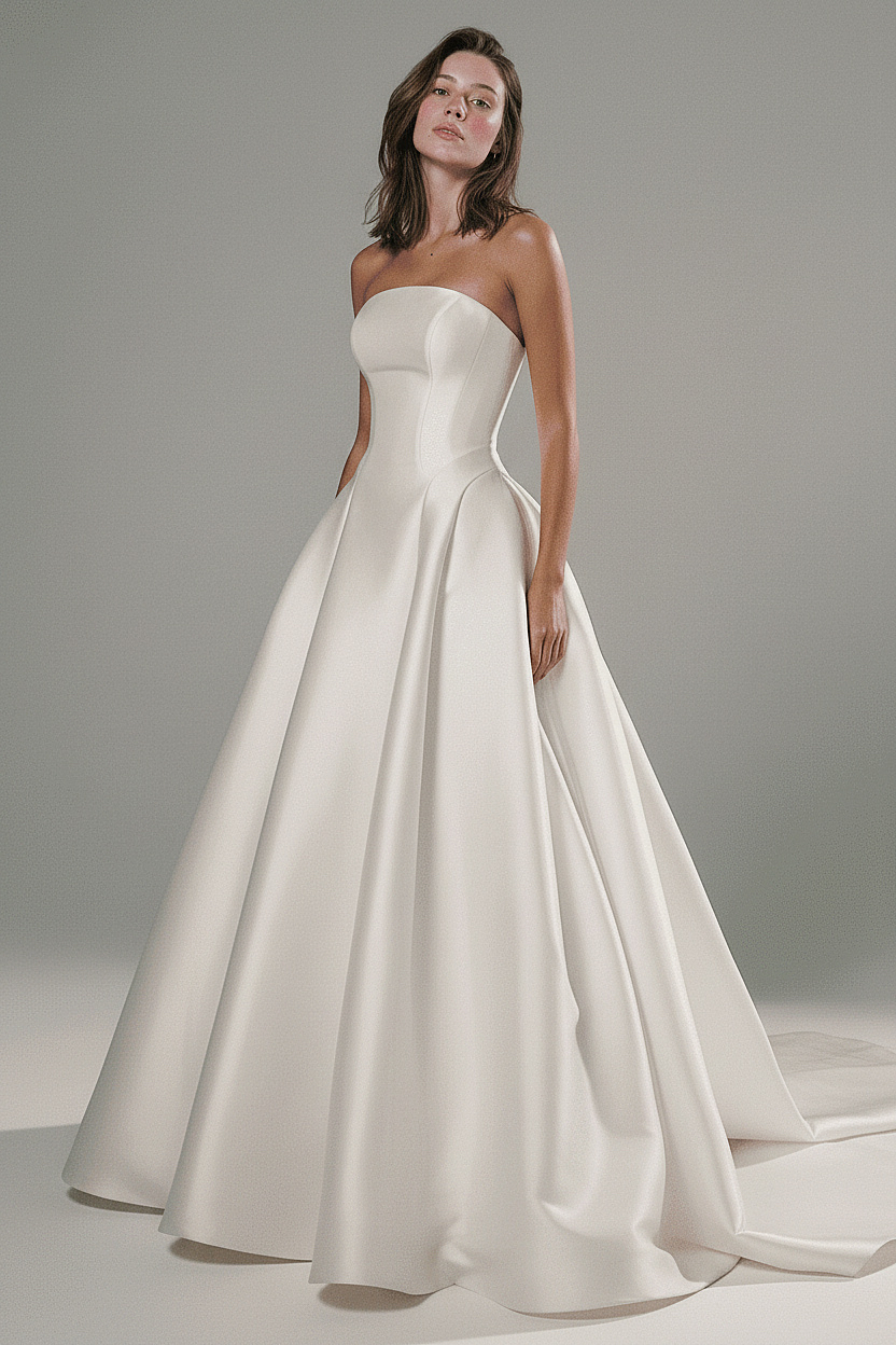 A timeless strapless bridal dress crafted in luxurious satin, featuring a sculpted corset bodice and a beautifully flowing full skirt. Clean lines, elegant structure, and a modern yet classic silhouette create an effortlessly refined bridal look.