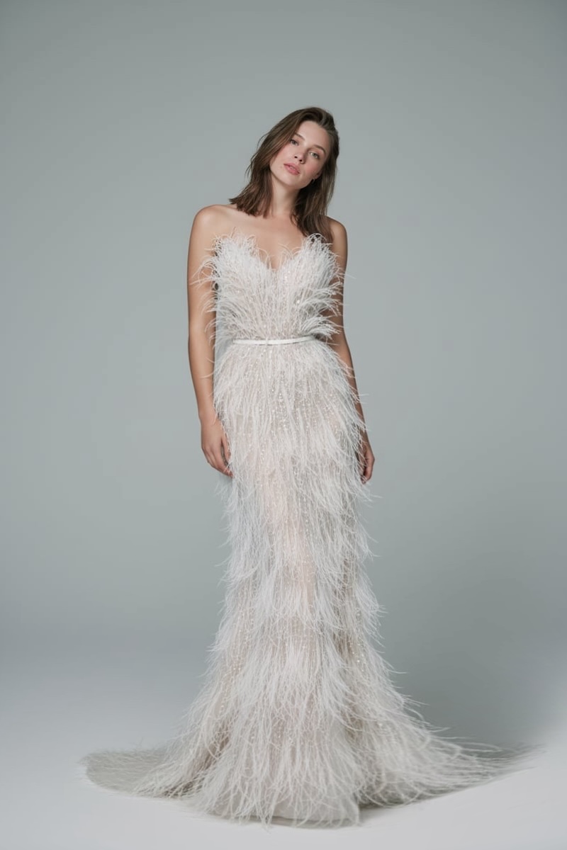 A statement-making couture gown designed for the bride who embraces drama and undeniable elegance. This strapless silhouette is fully adorned with luxurious feather detailing, creating captivating texture and fluid movement with every step. The fitted form enhances the figure while the subtle shimmer embedded within the feathers adds a modern, luminous touch. Effortlessly glamorous and unforgettable.