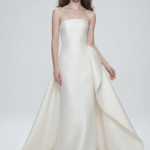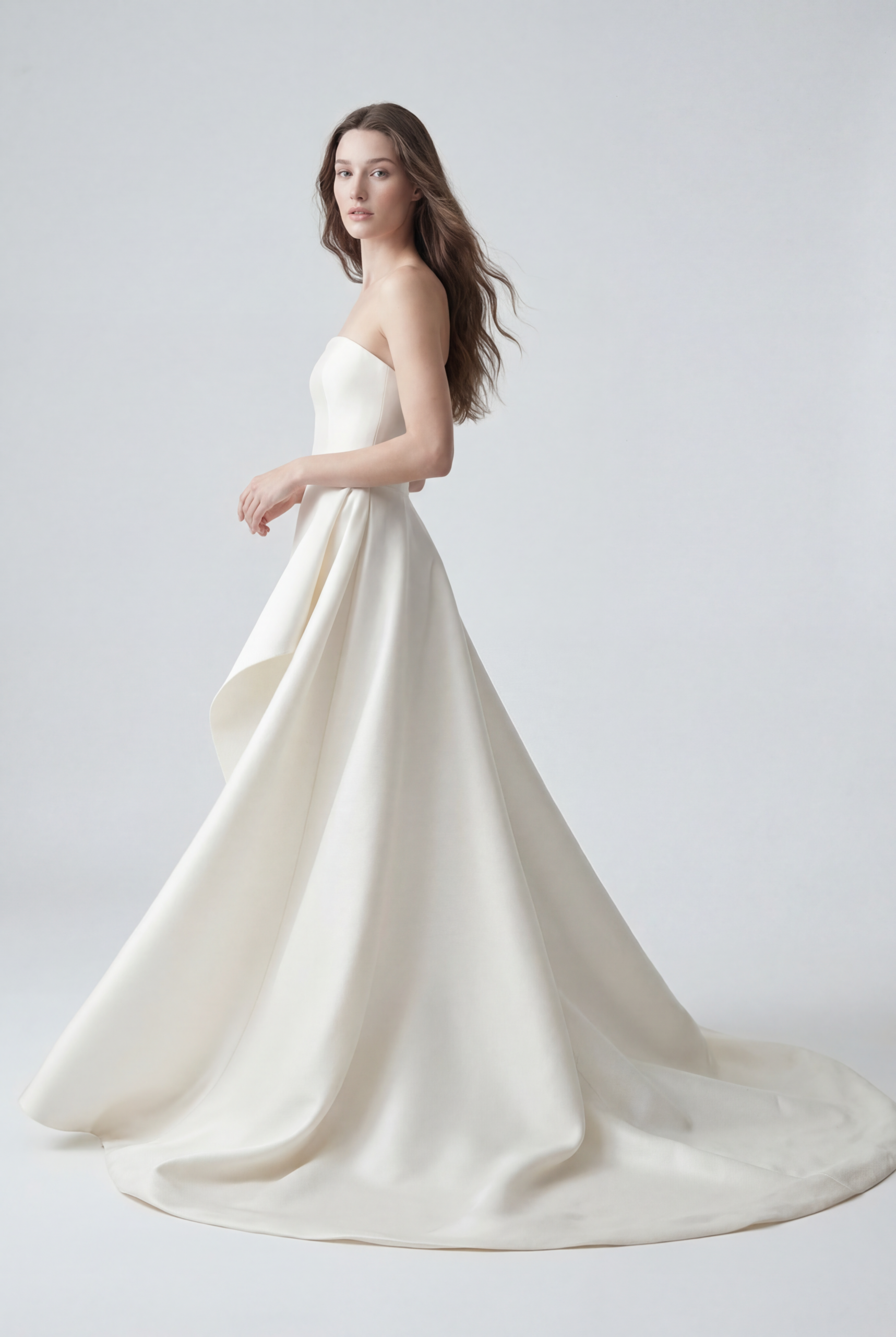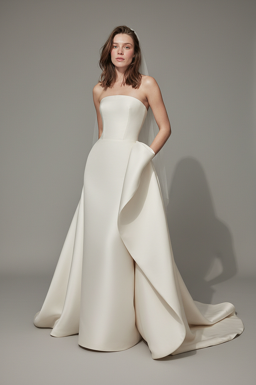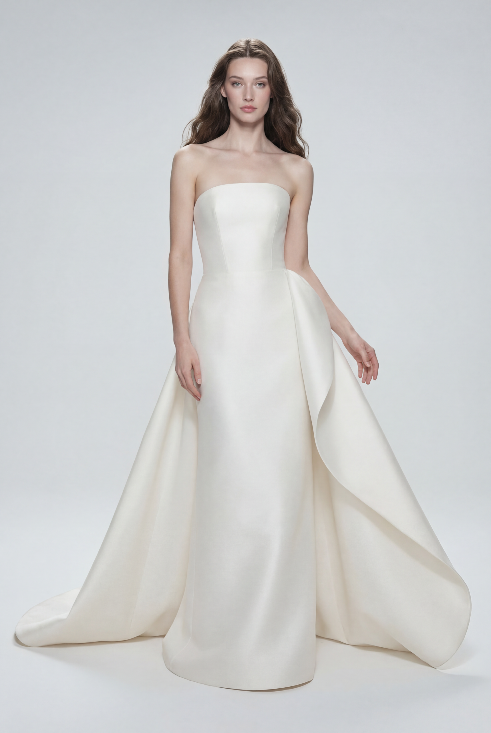 A refined strapless bridal dress featuring clean, structured lines and elegant cut that softly accents the silhouette. The overskirt adds dramatic volume and movement, creating a perfect balance of modern minimalism and romantic detail.