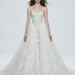 Yapılandırılmış straplez korse ve zengin hacimli eteğiyle romantik bir couture balo gelinliği. İnce çiçek dantellerle tasarlanan silüet, vücudu zarifçe sararken etek kısmı zamansız ve etkileyici bir gelin şıklığı sunar.