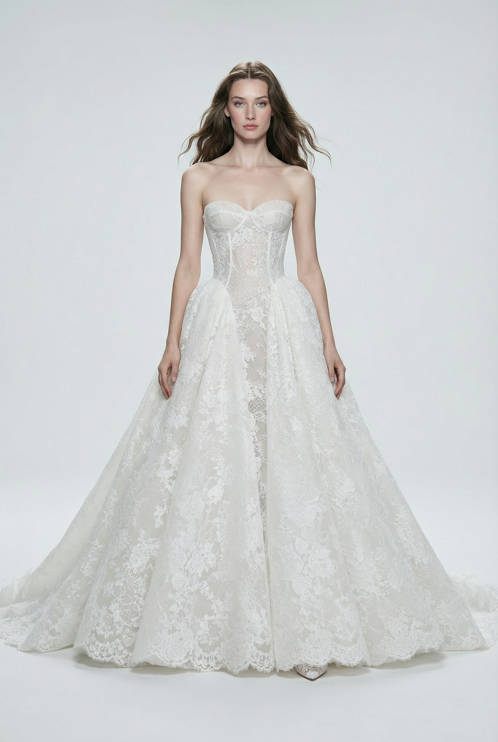 A romantic couture ball gown featuring a structured strapless corset and a voluminous skirt crafted from intricate floral lace. The sculpted bodice enhances the silhouette, while the airy skirt delivers timeless bridal drama with refined elegance.