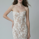 Yumuşak ten rengi zemin üzerine zarif çiçek dantellerle tasarlanan bu modern ve romantik mini gelinlik, hafif transparan etkisiyle feminen bir duruş sunar. Straplez silueti vücudu zarifçe sararken, üç boyutlu çiçek işlemeler couture şıklığı ve zarafet katıyor. Nikahta, after party’de veya modern bir düğün stilinde mükemmel bir tercih.