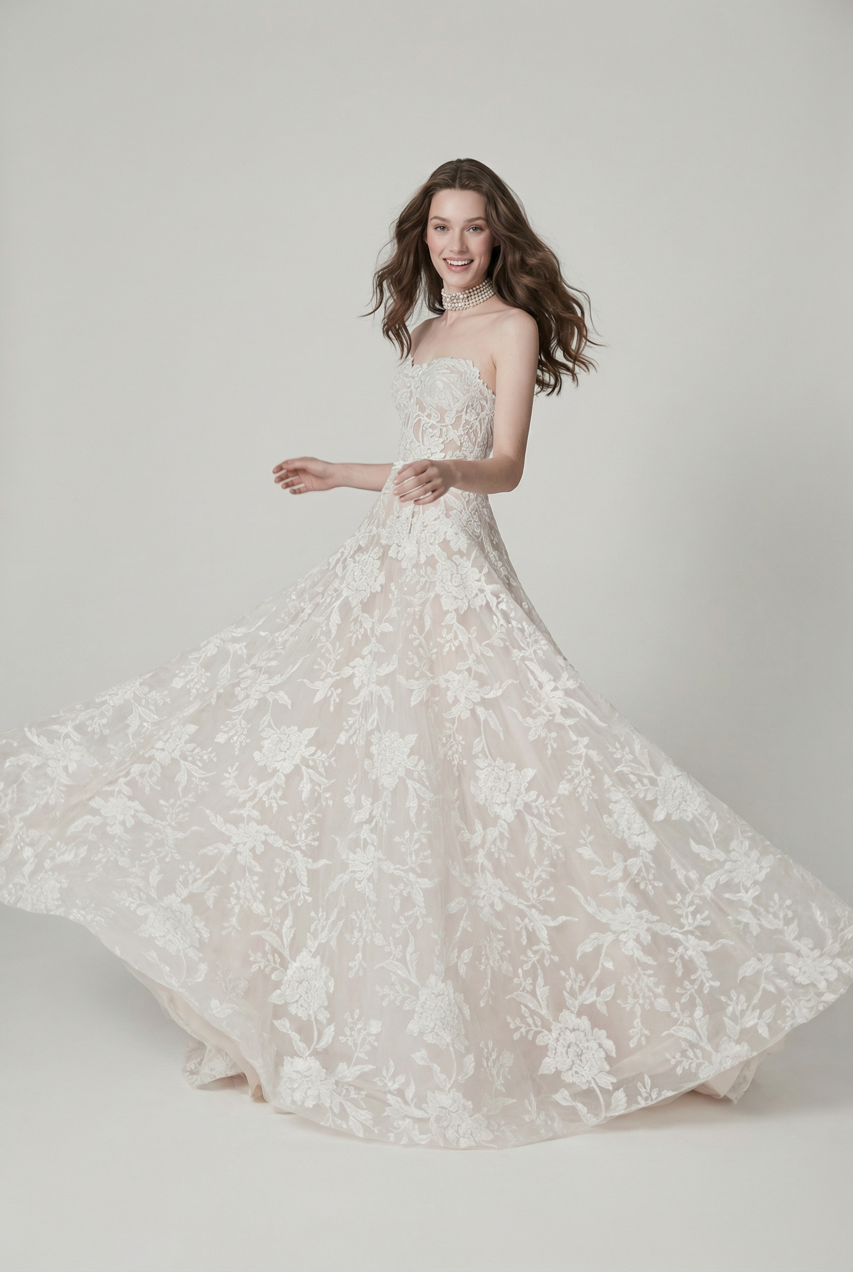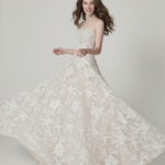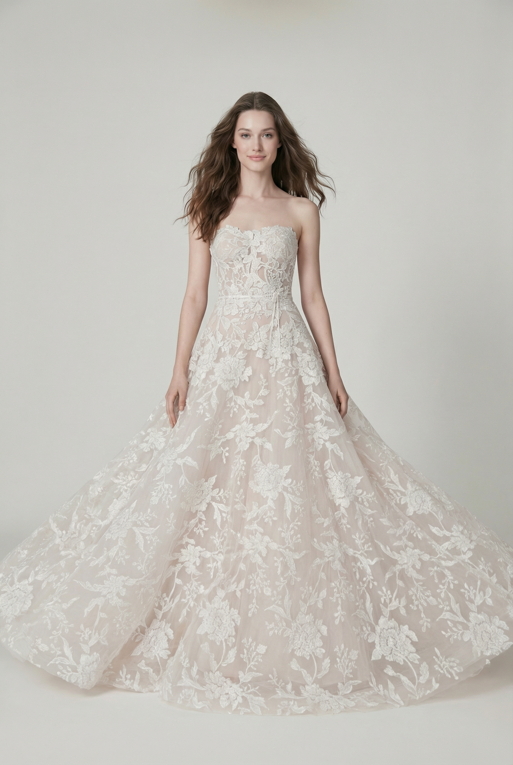 A dreamy strapless ball gown featuring dimensional floral lace layered over a soft nude base, creating depth and lightness. The silhouette is both romantic and contemporary, perfect for a bride seeking elegance with a modern touch.