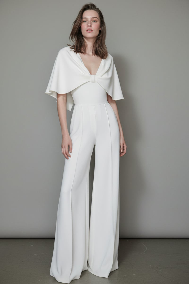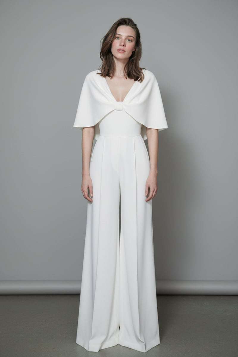 Expert construction defines the waist and elongates the form, while the cut shoulder cape introduces architectural softness. A balanced interplay of structure and drape creates a refined couture presence.
