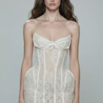 Şeffaflık ve yapı bu dantel mini tasarımda buluşur; transparan paneller bedeni çerçevelerken, heykelsi çizgiler beli vurgular. Ne giydiğini bilen, duruşuyla seçim yapan gelinler için tasarlandı.