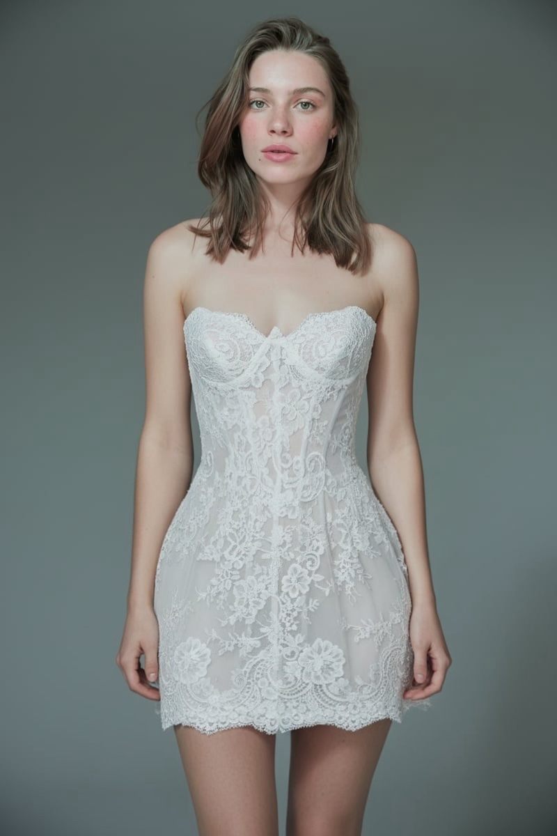 A modern yet romantic mini bridal dress crafted with delicate floral lace over a sheer base, shaping the body with its structured corset bodice. The strapless silhouette highlights the décolletage while the softly scalloped hem adds a feminine finish. Perfect for civil ceremonies, rehearsal dinners, or bridal after-party elegance.