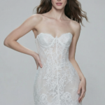 Zarif çiçekli dantel kumaşın transparan bir alt yapı üzerinde işlendiği bu modern mini gelinlik, yapısal korse gövdesiyle vücudu şekillendirir. Straplez siluet dekolteyi ön plana çıkarırken, dantel detaylı kenar bitişi feminen bir şıklık sunar. Nikâh töreni, after party veya özel kutlamalar için mükemmel bir seçimdir.