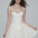 Zarif balen detayları ve düğmeli ön kapamasıyla şekillendirilmiş dantel korse, bele kusursuz bir form kazandırarak yumuşak açılan mini etekle tamamlanır. İnce çiçek desenli dantel kumaşıyla klasik feminenliği modern bir gelin siluetiyle buluşturur. Nikâh törenleri, davetler ve after-party anları için zarif ve iddialı bir tasarımdır.