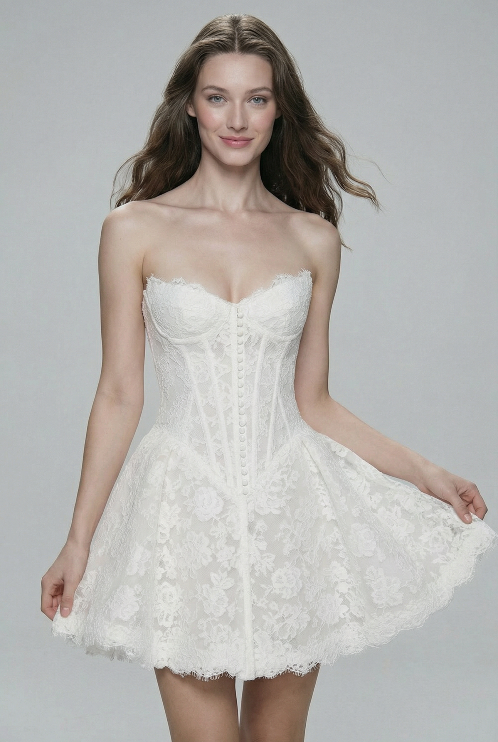 A beautifully structured lace corset defines the waist with classic boning and delicate button detailing, flowing into a softly flared mini skirt. Crafted from intricate floral lace, this design blends timeless femininity with a modern bridal silhouette. Perfect for civil ceremonies, receptions, or after-party moments with elegant confidence.