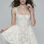 İnce askılar ve yumuşak kare yaka ile tamamlanan dantel korse, silueti zarif bir şekilde şekillendirir. Hareketli mini etek formu, elbise boyunca uzanan floral dantel dokuyu öne çıkararak romantik ve hafif bir görünüm sunar. Nikâh, davet ya da after party için modern ve feminen bir gelinlik arayan gelinler için tasarlanmıştır.