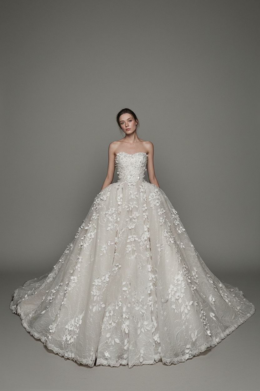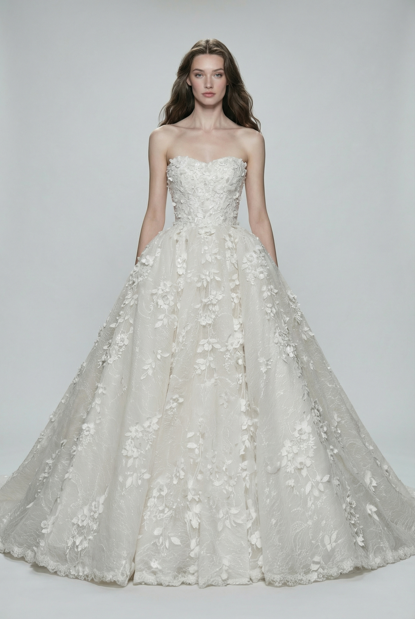 A majestic ballgown crafted in luxurious floral lace, featuring a strapless sweetheart neckline that enhances the décolletage with refined romance. The voluminous skirt cascades into a dramatic silhouette enriched with dimensional appliqués and intricate lace textures, creating a fairytale presence with couture sophistication.