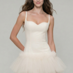 Yapılandırılmış korsaj üstü ve zarif askı detaylarıyla tasarlanan modern bir gelin elbisesi. Pürüzsüz formdaki üst bölüm, hacimli mini tül etekle tamamlanarak şık ve genç bir siluet sunar. Nikah, after party ve modern gelin stilleri için idealdir.