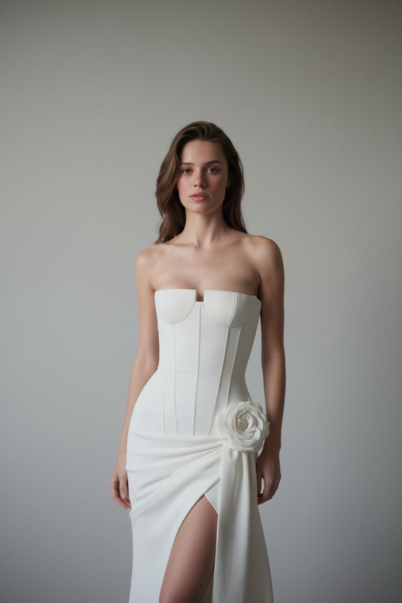 A refined strapless corset dress where structure meets fluidity. The floral embellishment draws attention to the slit, offering a modern bridal statement with understated drama.
